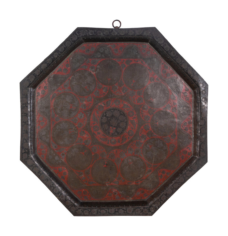 A Middle Eastern Mixed Metal Inlaid Tray on Stand