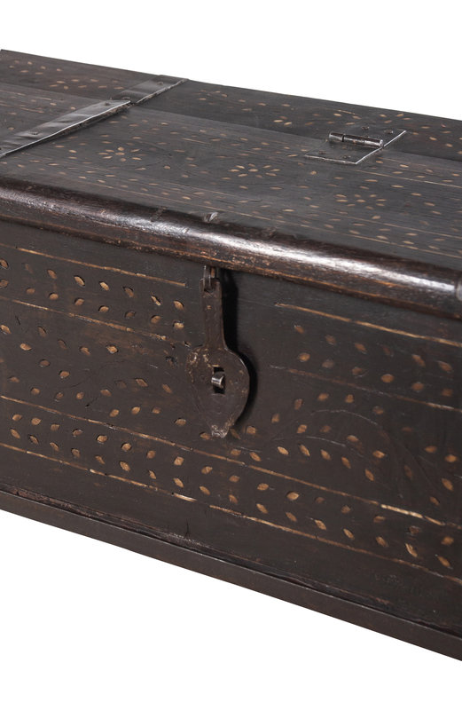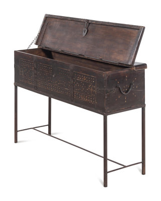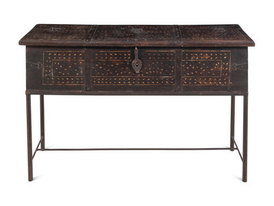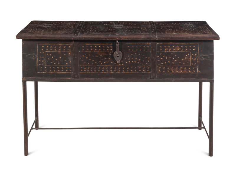 A Syrian Iron Mounted and Bone Inlaid Trunk on a Later Stand