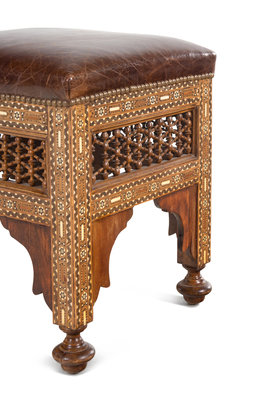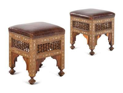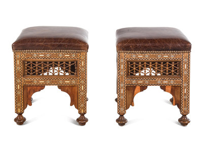 A Pair of Syrian Bone Inlaid Ottomans with Leather Upholstery