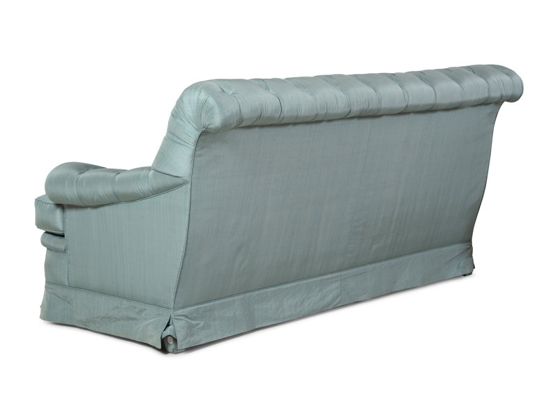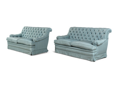 A Pair of Custom French Silk-Upholstered Button Tufted Sofas