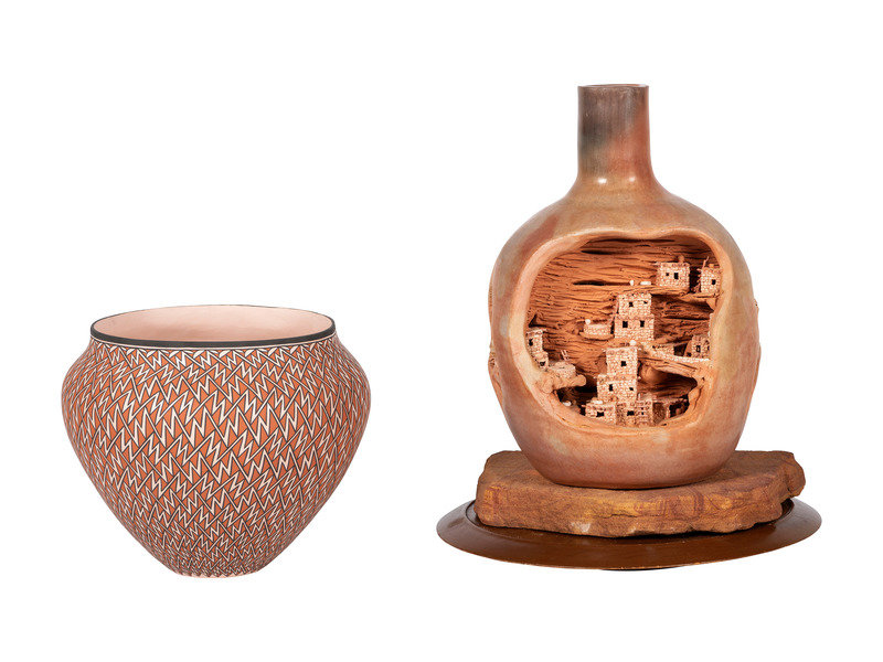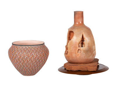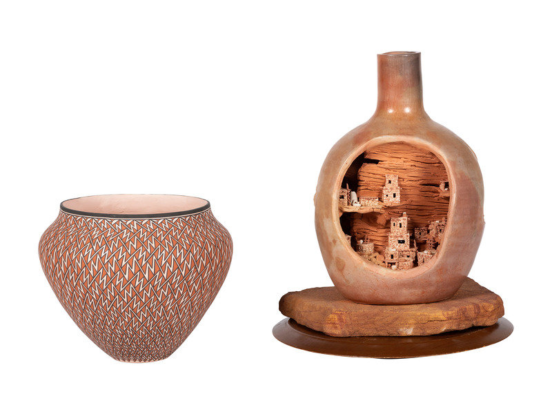 architectural pottery vase, with scenes of Mesa Verde ; signed and dated 91 on base