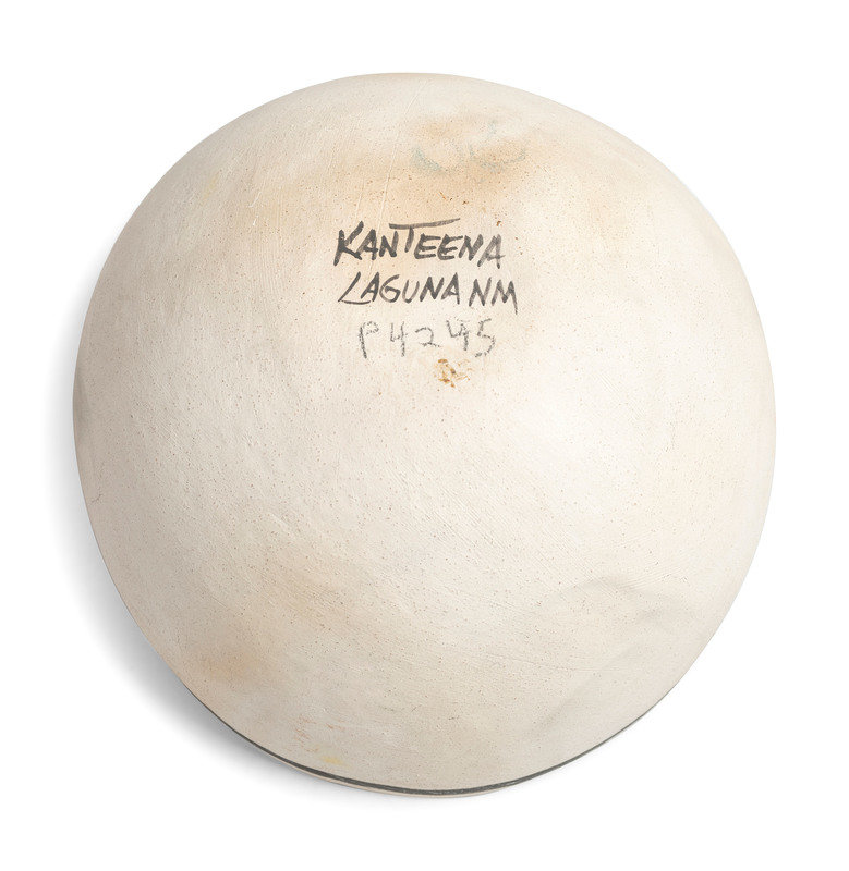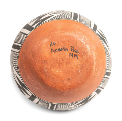 a small Acoma jar with fine line decorations; marked Jo / Acoma, NM