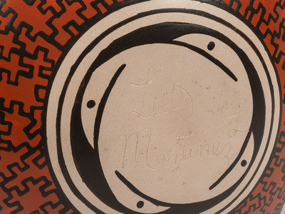 a vase decorated with lizards and birds by Lucy Martinez, signed on base