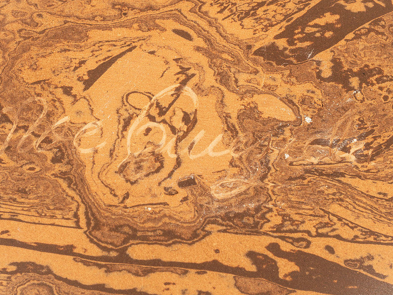 a scroddled brown and tan jar; signed on base