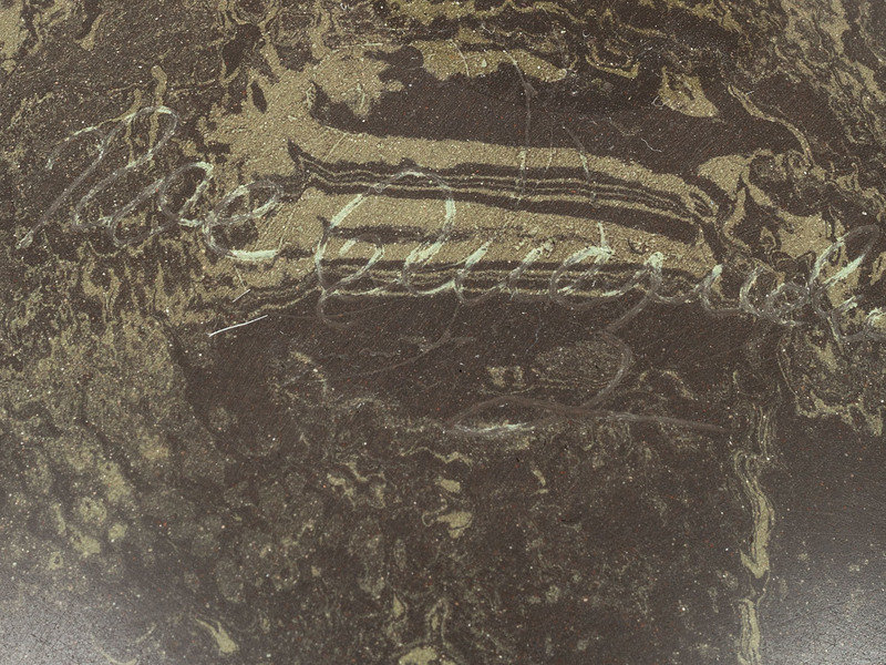 a scroddled green and tan jar; signed on base