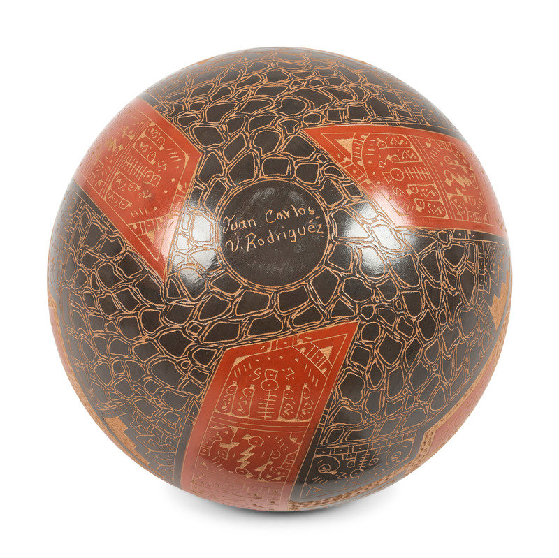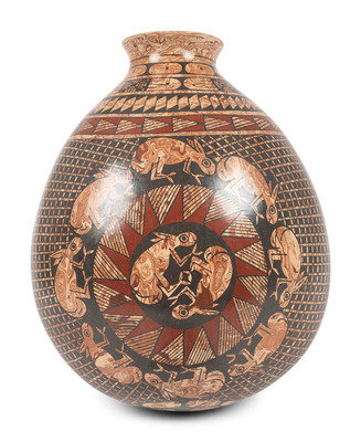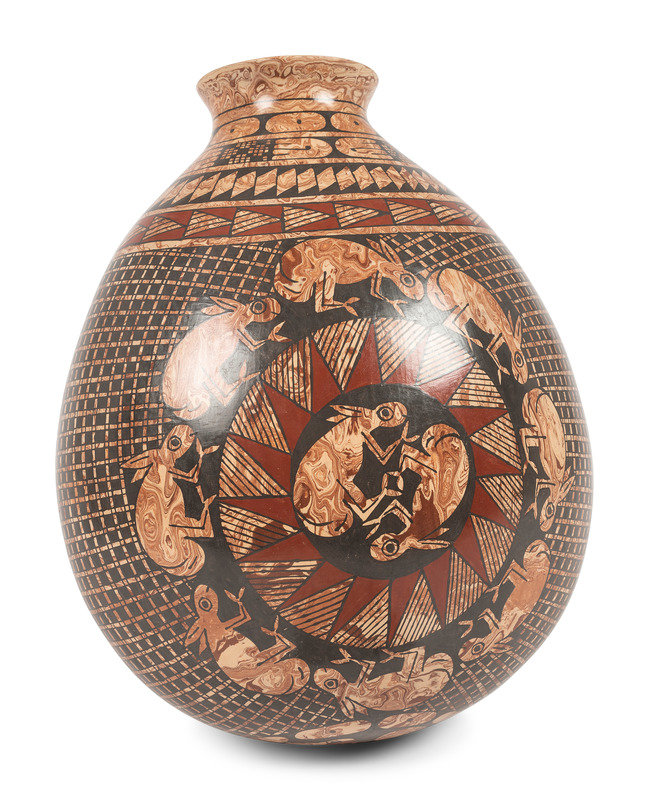 red, tan, and black sgraffito jar, with lizards; signed on base