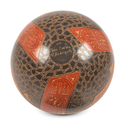 black, tan, and red seed jar; signed near base