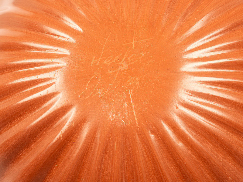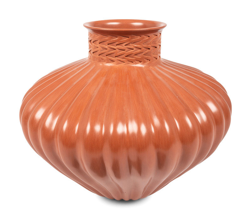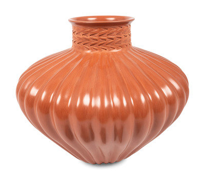 light weight jar designed with a ribbed body and basketry-style neck; signed on base