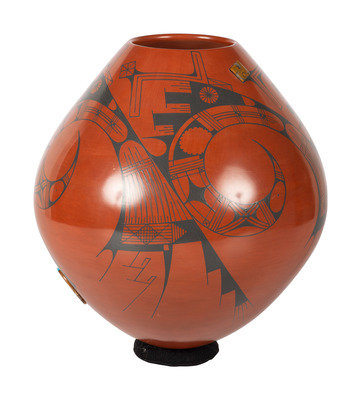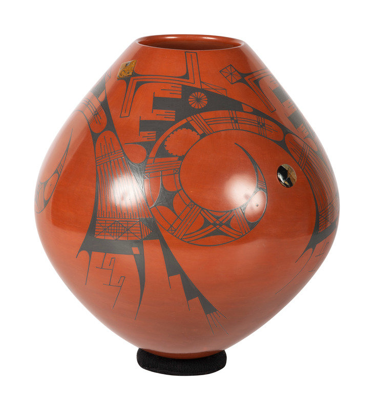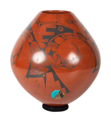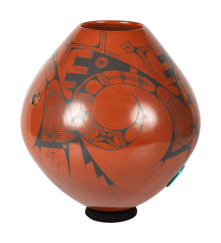 Redware Pottery Vase, with Turquoise and Agate Medallions