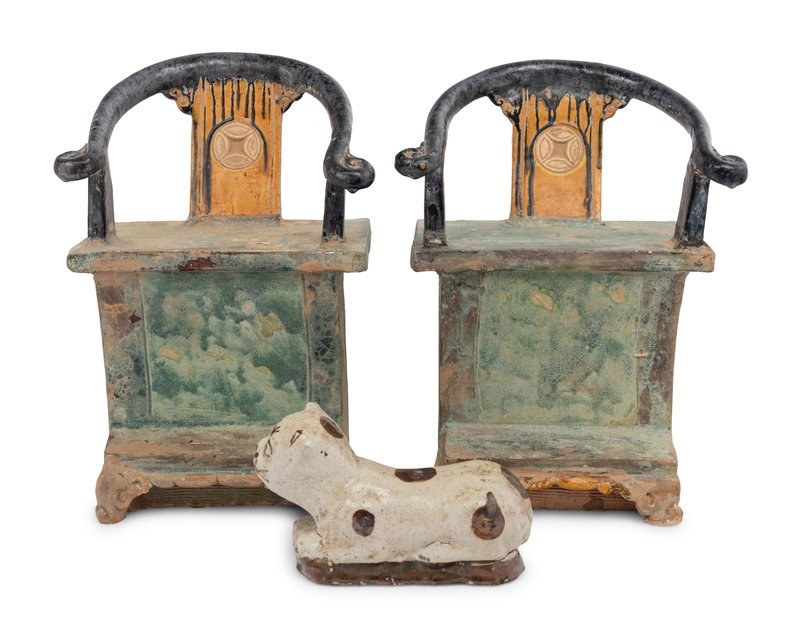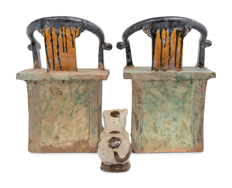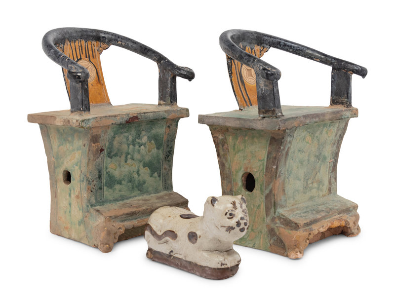 comprising a pair of sancai glazed models of throne chairs and a cizhou style cat-form pillow.