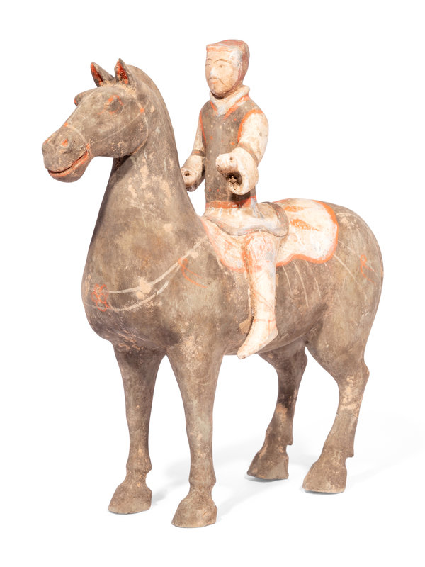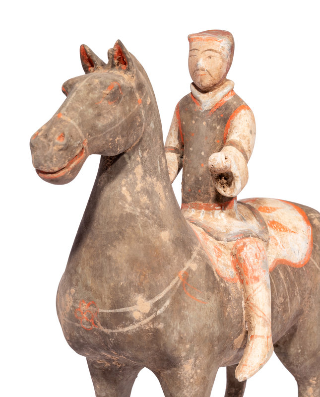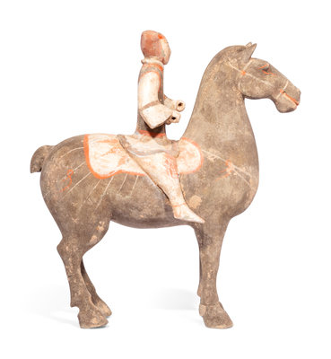 the horse standing foursquare, depicted with the equestrian sitting astride a painted saddle.