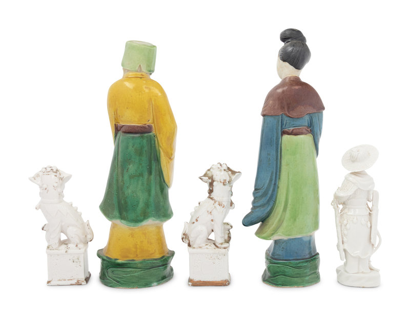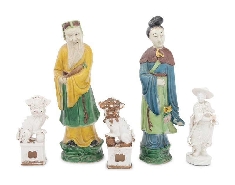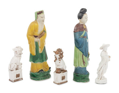 comprising three standing figures of immortals and two figures of seated male fu-lions.