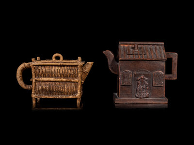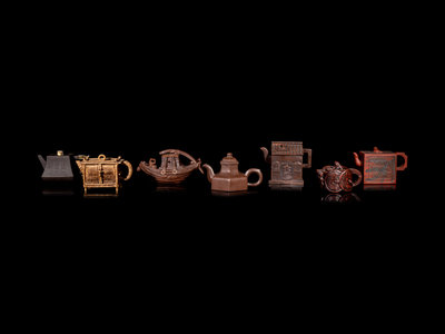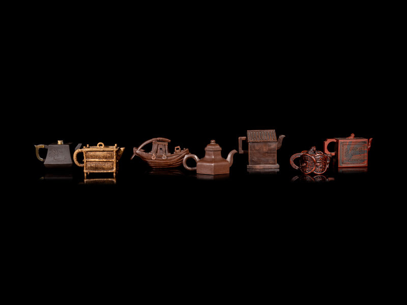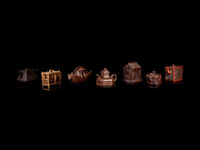comprising one boat-form example, one of hexagonal section with a tapered neck, one basket-form example, one of interlocking 'coin' motif, one basket-example, a house-form example, and others.