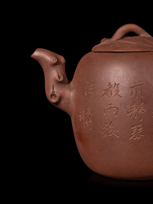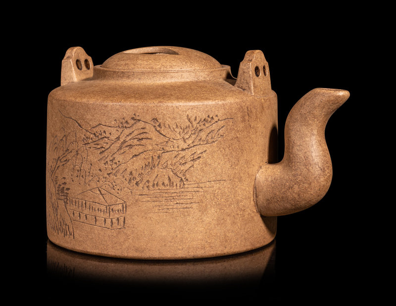 comprising a petite 'landscape' example, and a globular example incised with a landscape opposite verse, molded with naturalistic gnarled tree form spout and handle.