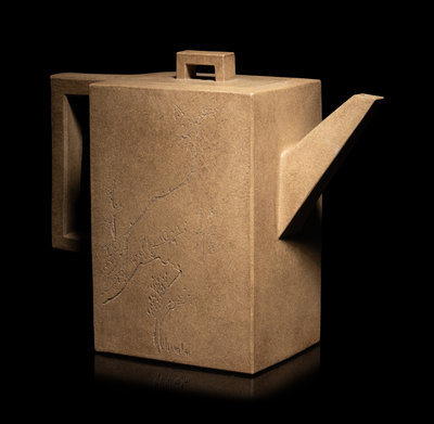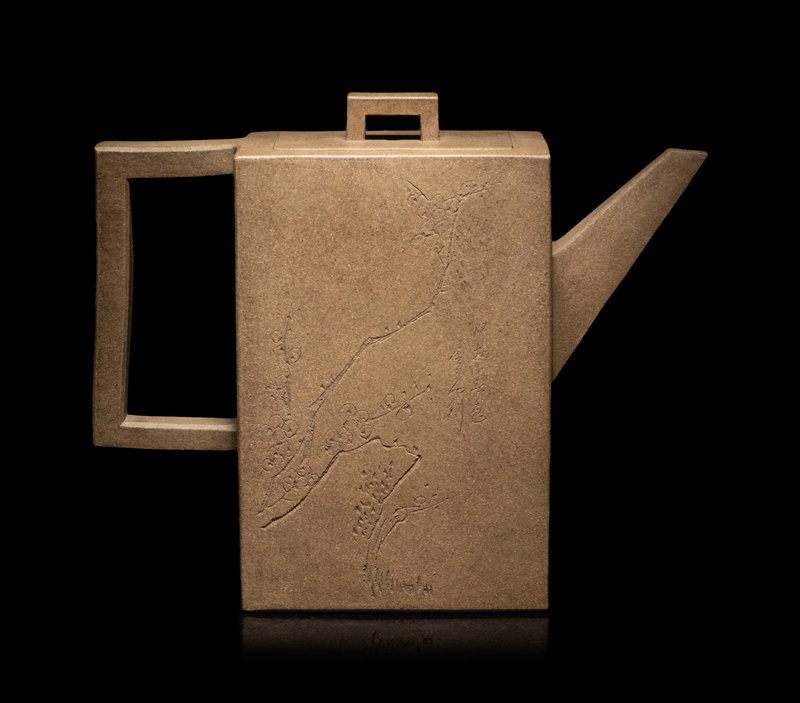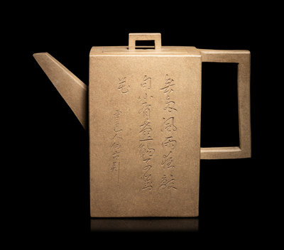 of rectangular form, flanked on the short sides with a sectioned handle and angular spout, and decorated with verse.