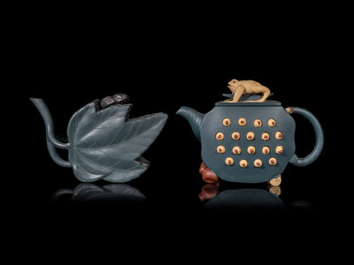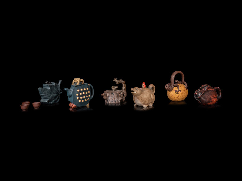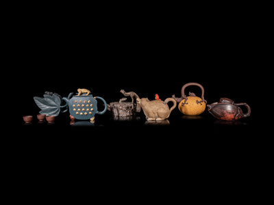 comprising six teapots and three teacups with various botanical and animal motifs.