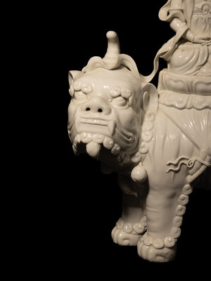 comprising two examples each depicting the Guanyin figure riding on a fu lion, one example showing Guanyin seated on rockworks with her attendant standing.