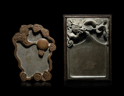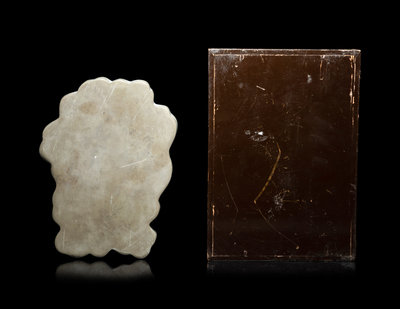 the first of ruddy tone, carved to an irregular form with lingzhi, the second of rectangular form, carved in higher relief with a dragon.