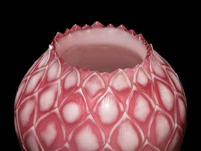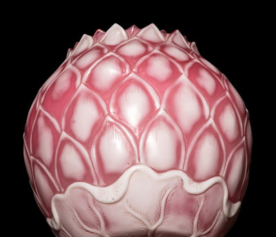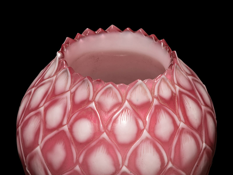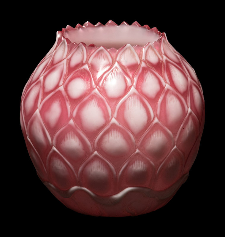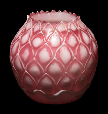 of white and rose overlay molded with layers of petals rising to a serrated mouth rim.
