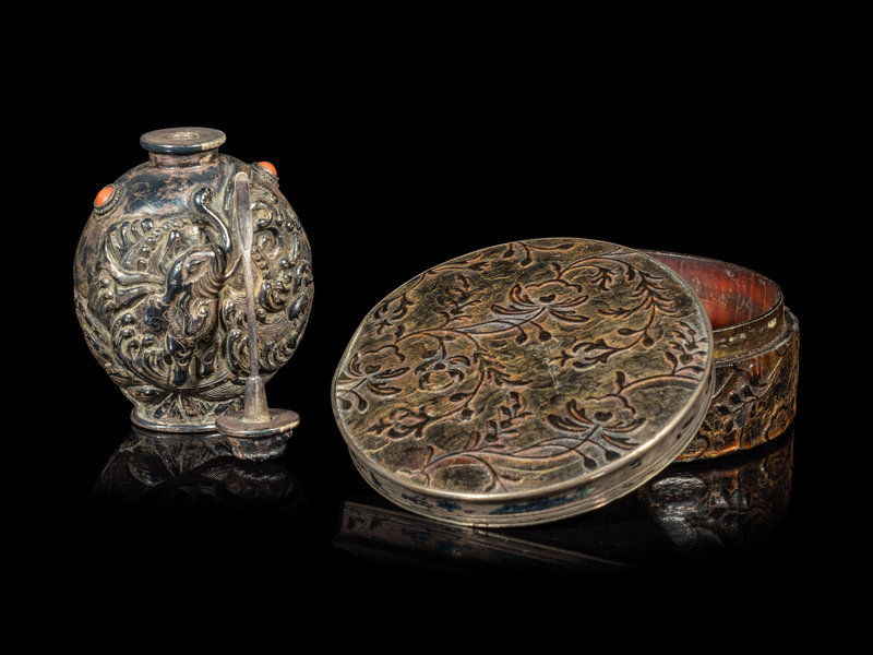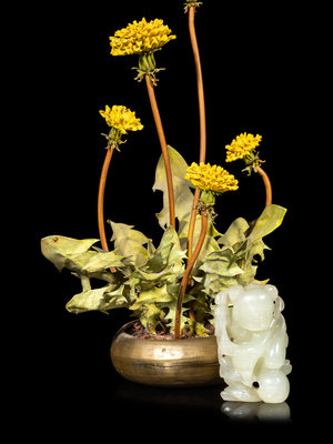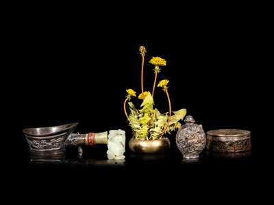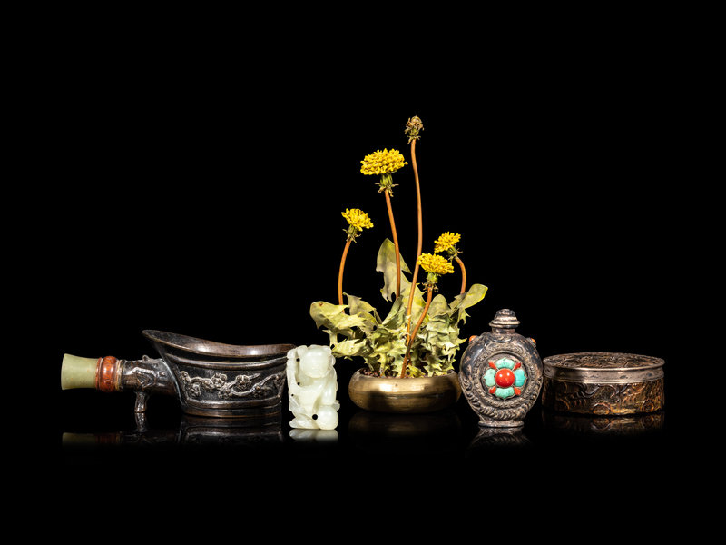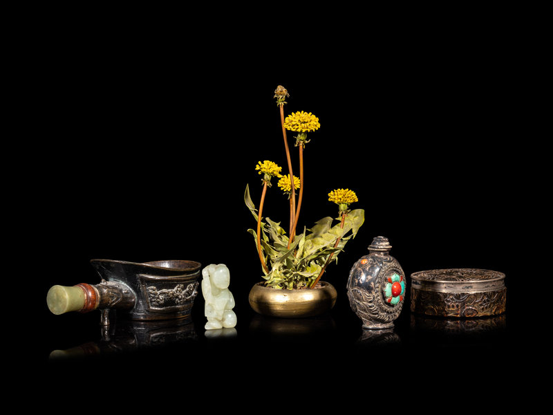 comprising a celadon jade figure of a boy, the second a Mongolian hardstone inset silvered metal snuff bottle, the third a celadon jade mounted bronze iron, the fourth a bronze and lacquered covered box, the fifth a metal 'chrysanthemum' planter.