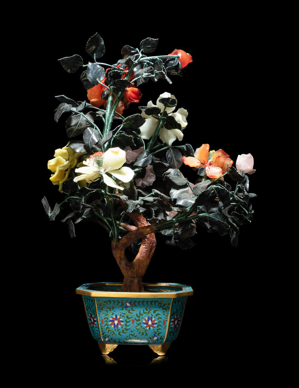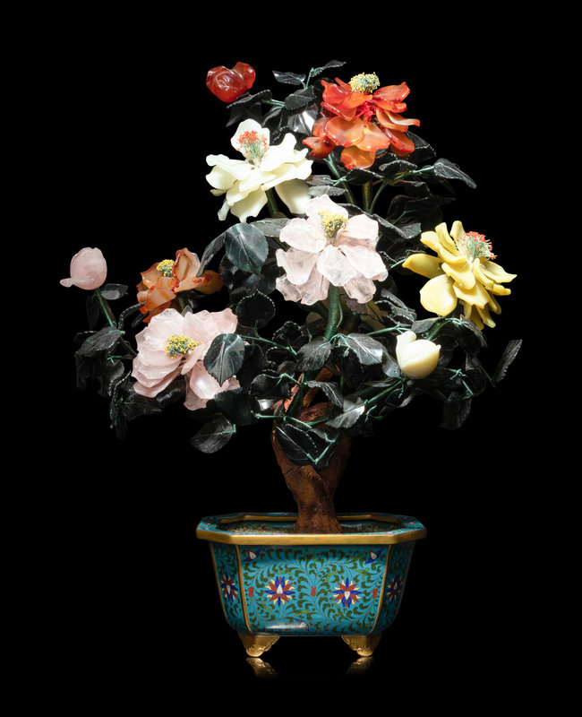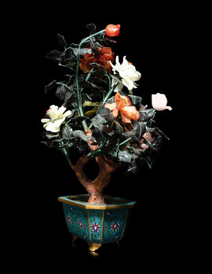 A Chinese Hardstone Peony Tree in A Cloisonné Enamel Jardinière