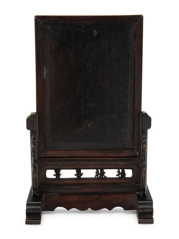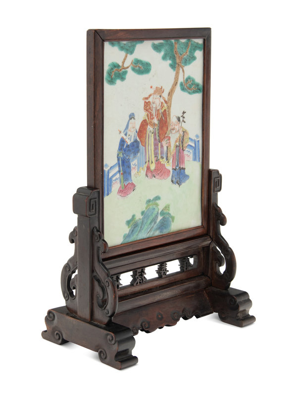 the rectangular porcelain plaque painted in polychrome enamels to show a conference of immortals in an architectural landscape set within a metered frame above a well-carved easel stand reticulated with a message of long-lived prosperity.