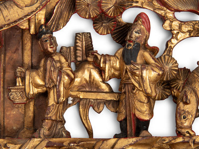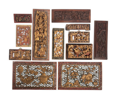 comprising ten examples carved in high relief, decorated in red and gilt lacquer, and two lower relief examples, one with prunus, the other with immortals against a ground of puffy clouds.