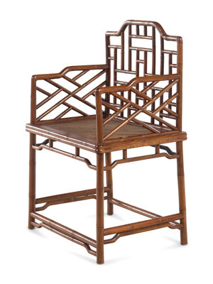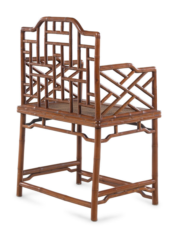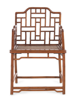 the rectangular seat having a woven mat, and supported by armrest and back splat worked in intricate design of latticed bamboo, supported by four rounded legs joined by curved stretchers.