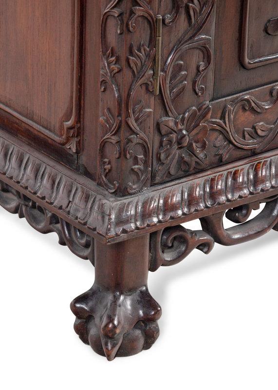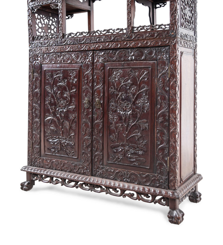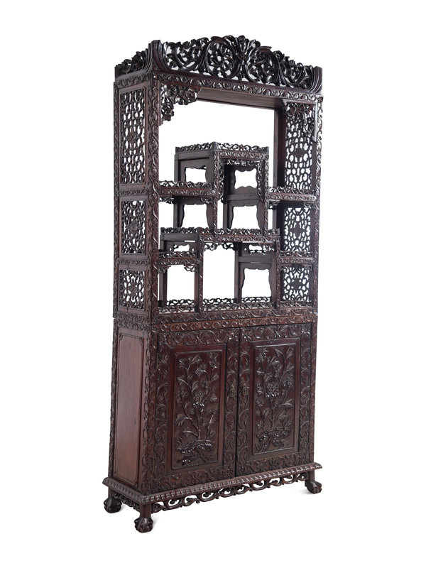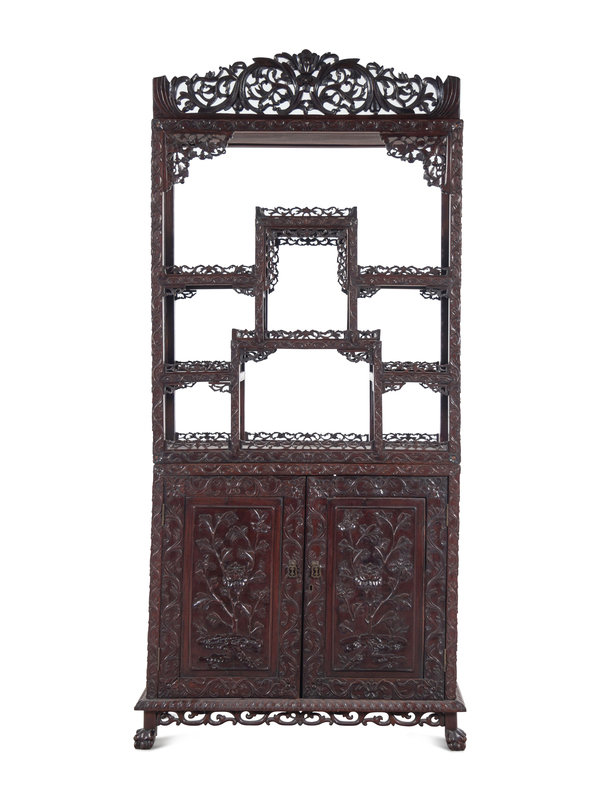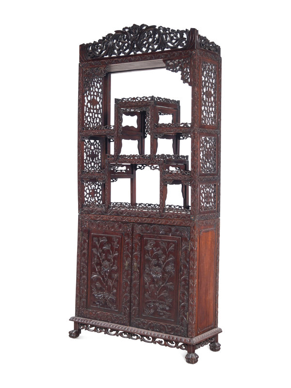having a rectangular base with two cupboard doors carved with flower stems supporting an openwork displaying cabinet reticulated with dense scrollwork about tiered open shelves.