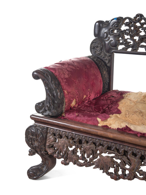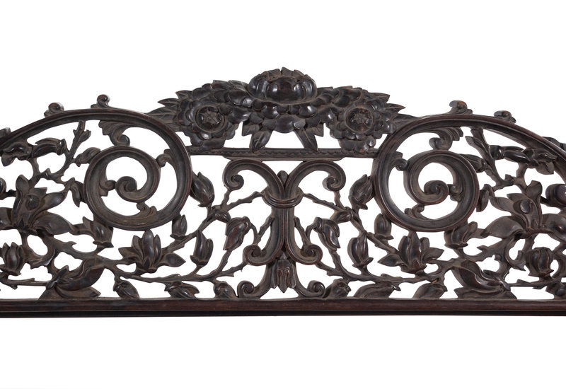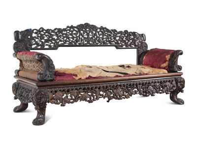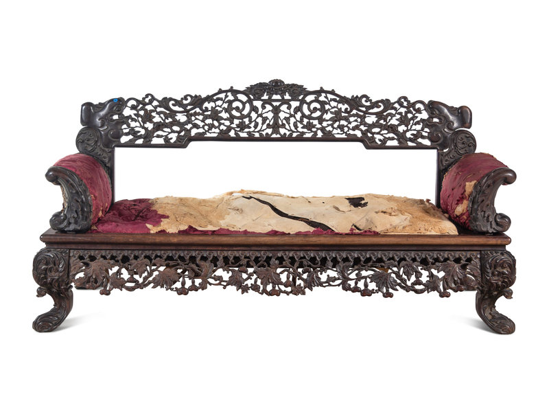 carved of rectangular form and supported by four animal-mask feet joined by elaborate seat and crestrails caned and pierced with twisting vines bearing double gourds.