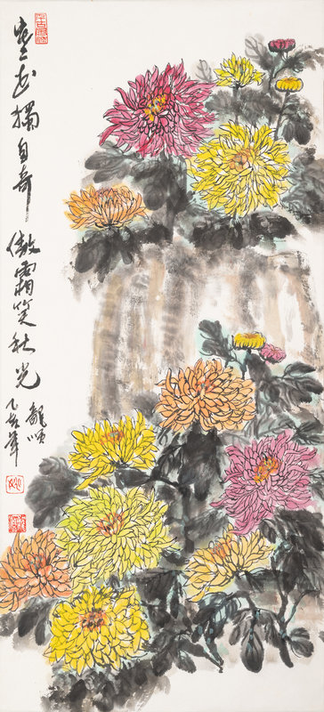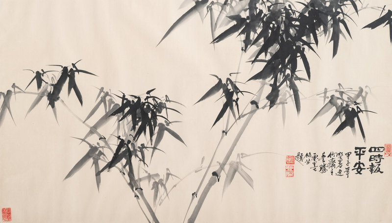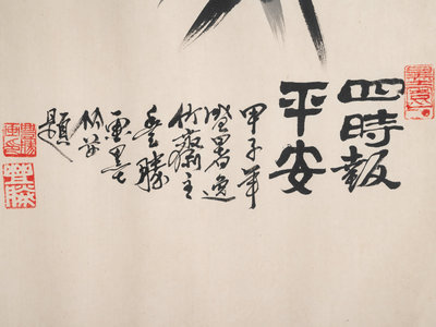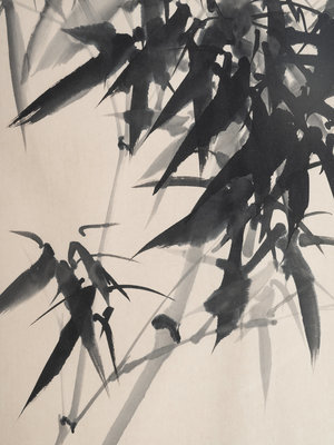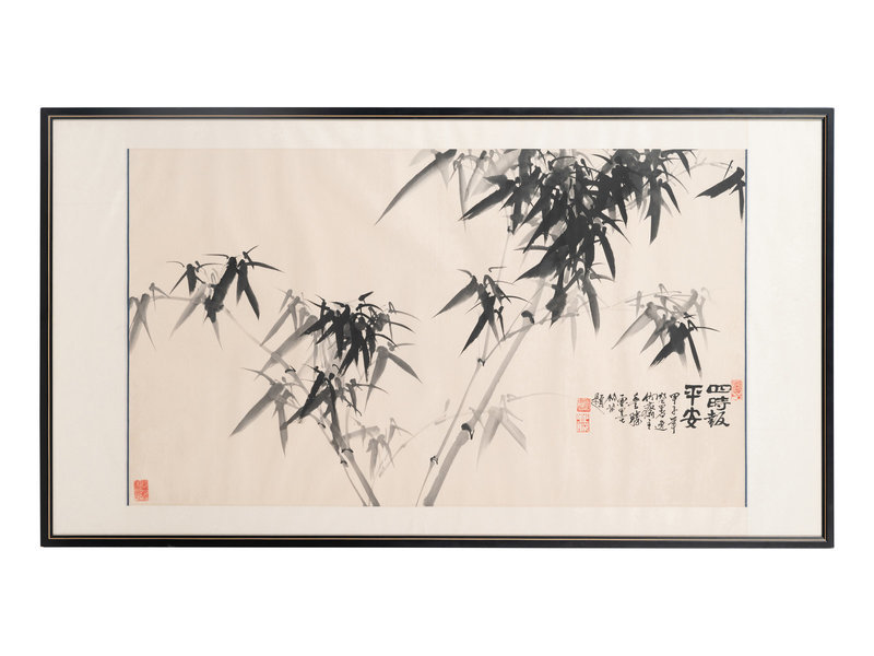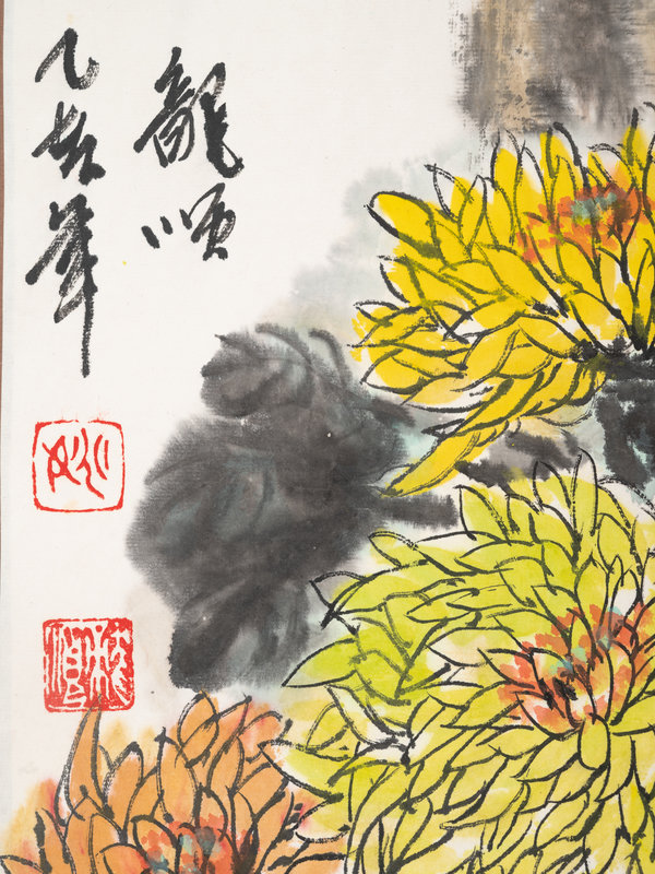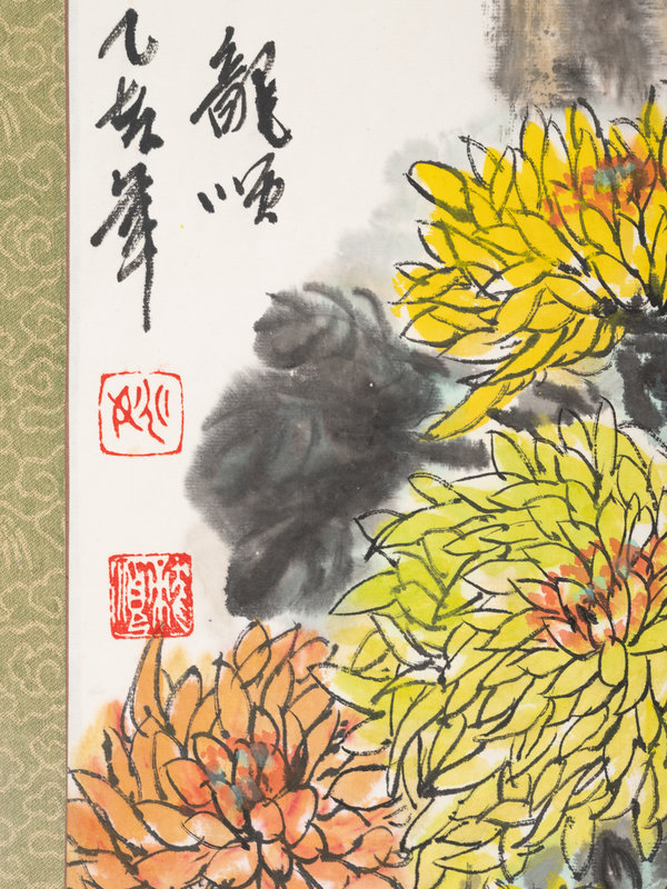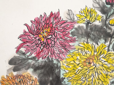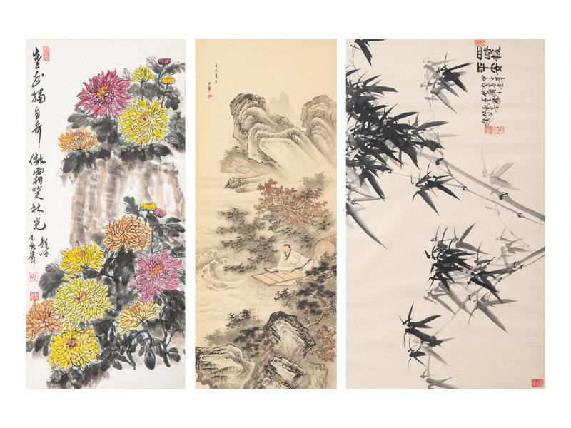 comprising one hanging scroll depicting chrysanthemums, one hanging scroll print depicting landscape, and one framed painting depicting bamboos.