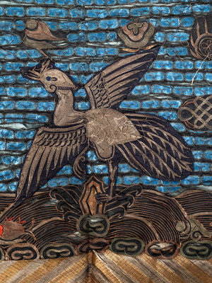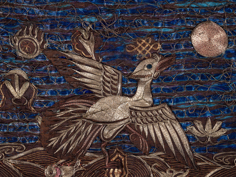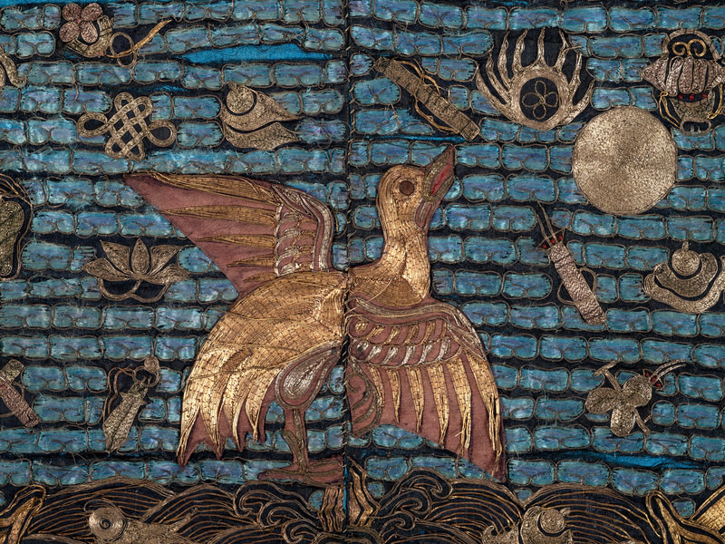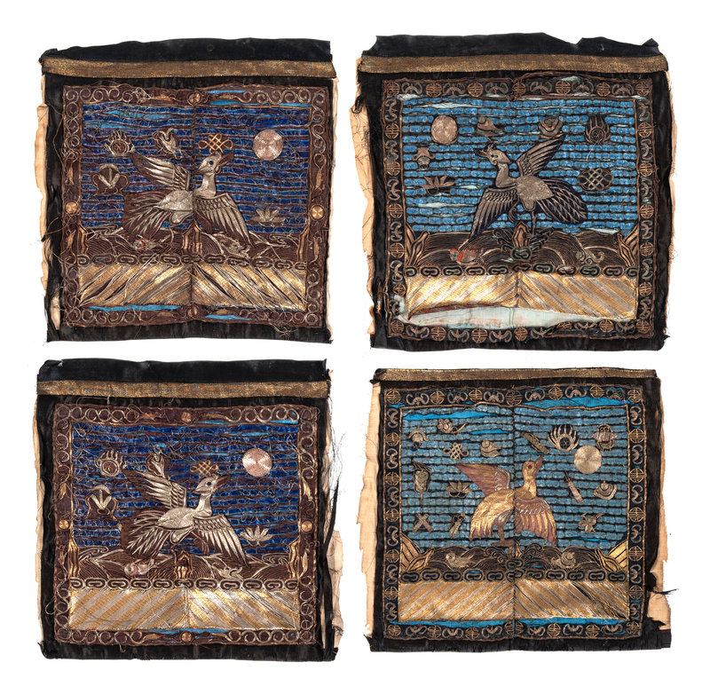 each of square form and bordered with bats and longevity symbols, worked in gold and silver metallic threads to depict the central birds surrounded by auspicious emblems on a blue ground, above a lishui borders; comprising one wild goose example and three cranes.