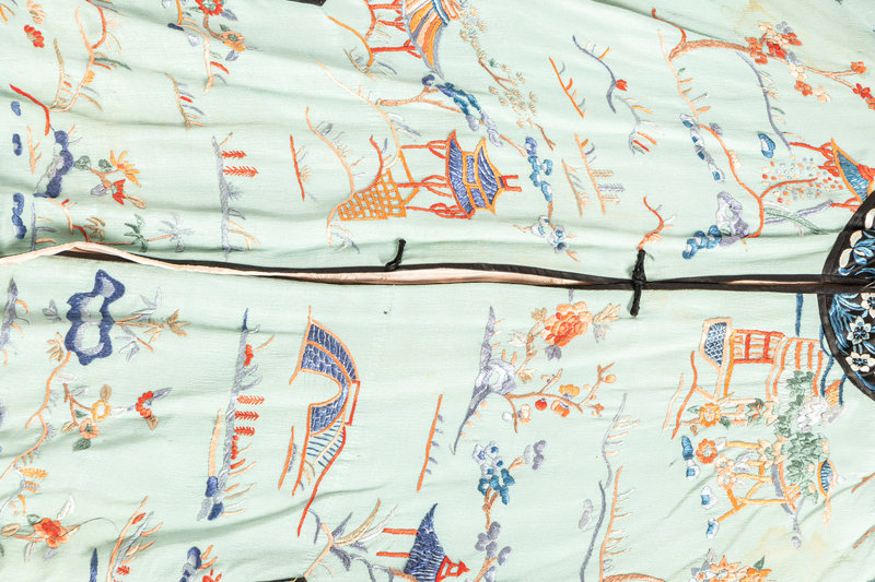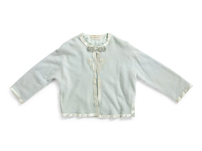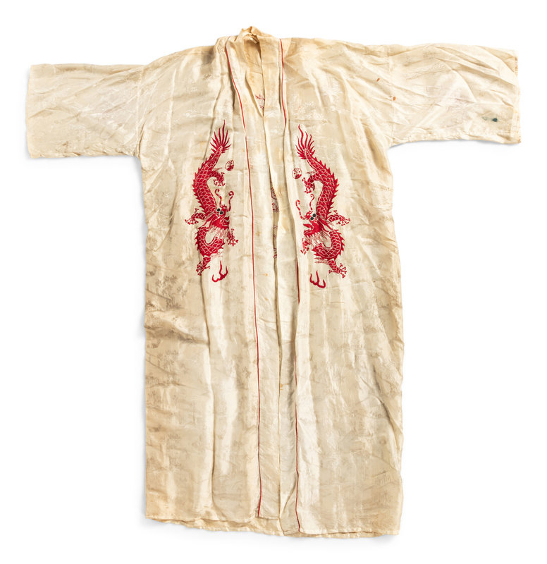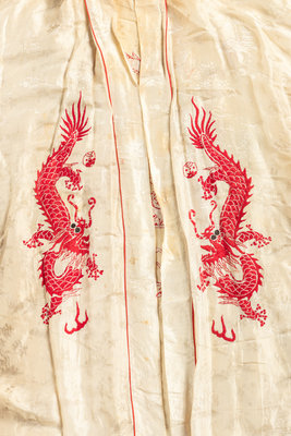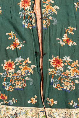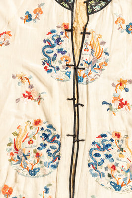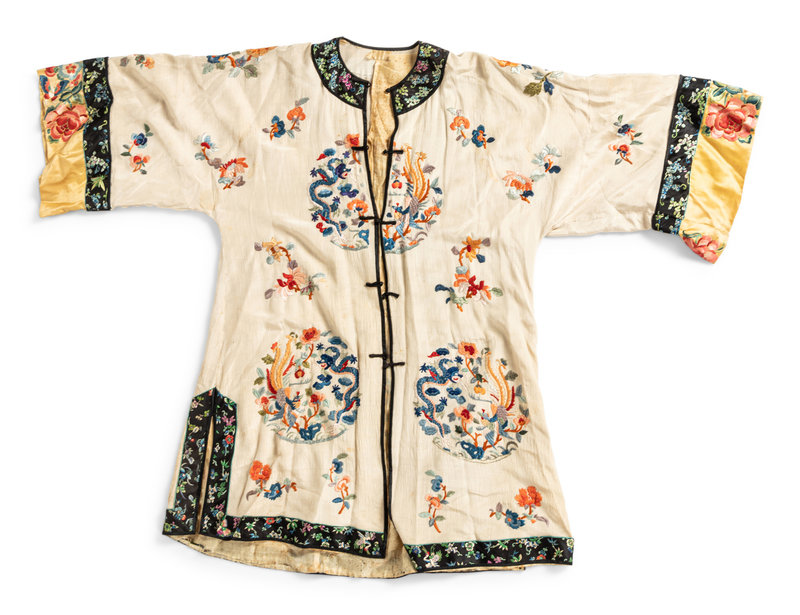 comprising three robes with central toggle closure embroidered with various floral motifs, one cream ground open robe embroidered with dragons, and one cashmere blend cardigan trimmed with silk and finished with foliate toggle closures.