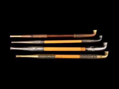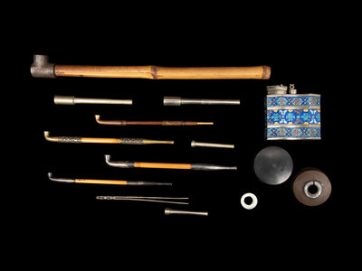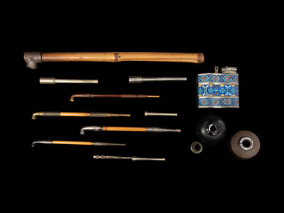 together with 4 metal pipe holders, a partial Chinese water pipe set, a small clamp and a small pot.
