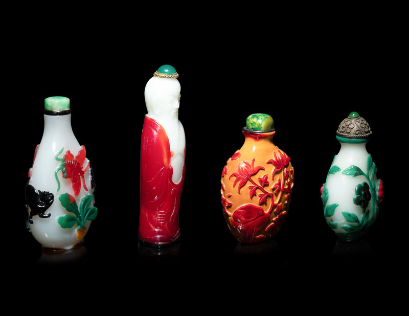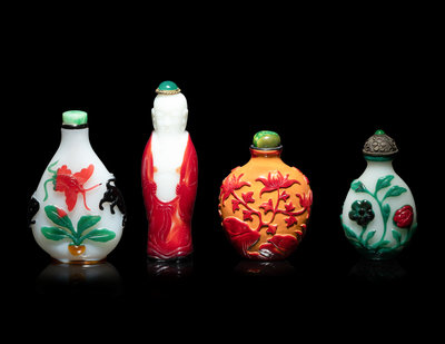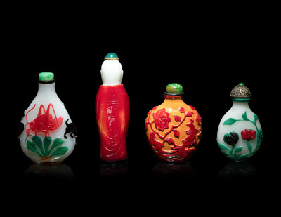 comprising two multi-colored overlay milky glass examples, decorated with flowers and insects; one red overlay orange glass example decorated with lotus scrolls; one red overlay milky glass example in the form of a standing immortal.