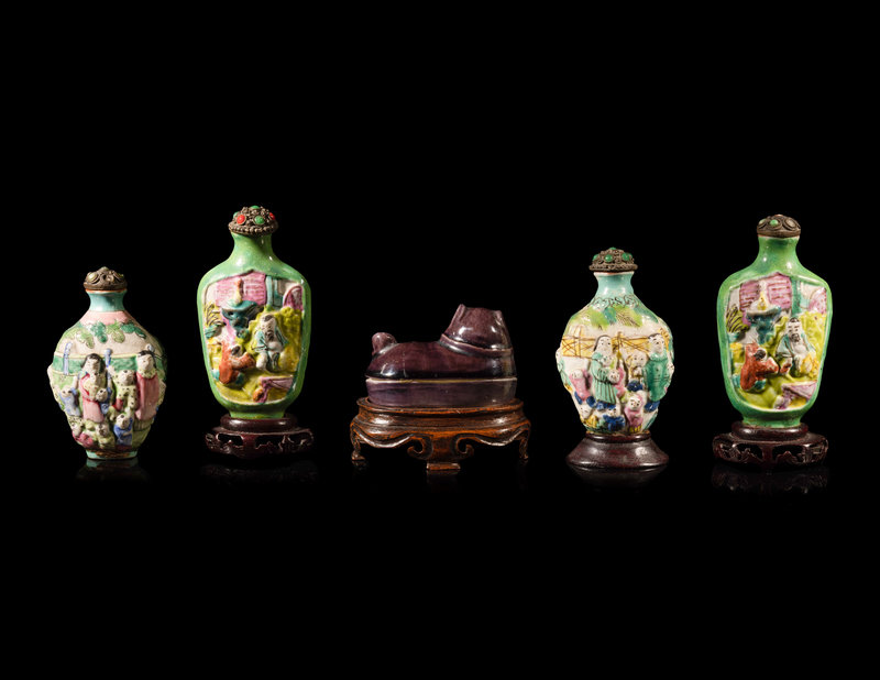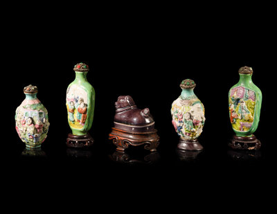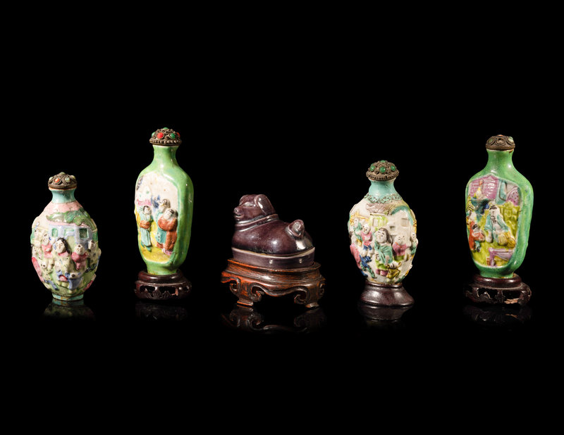 each snuff bottle molded in relief to show various figures, comprising two of baluster form and two shield form examples. The weight molded in the form of a recumbent juvenile dog with a curled tail and piqued ears.