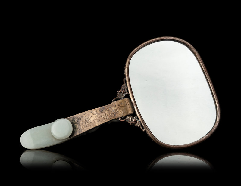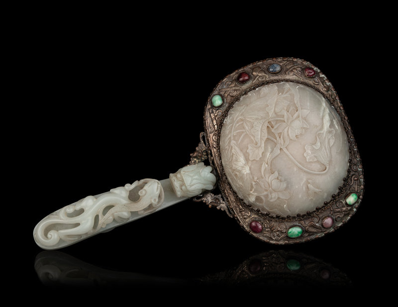 A Chinese Celadon and White Jade-Mounted Silver Hand Mirror