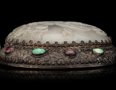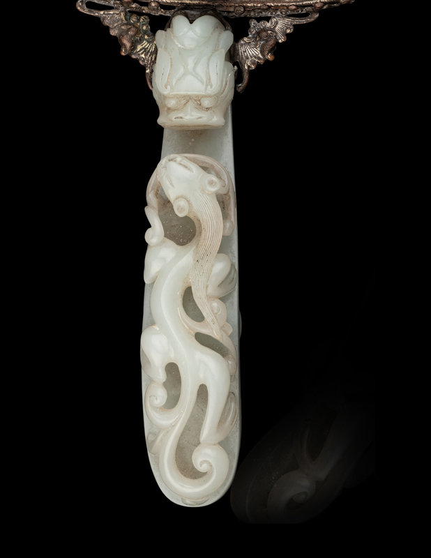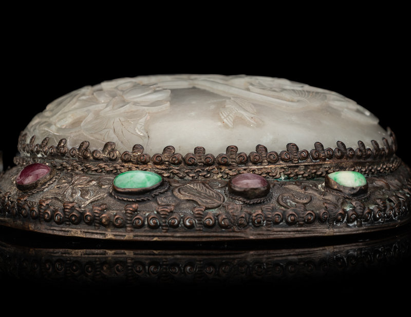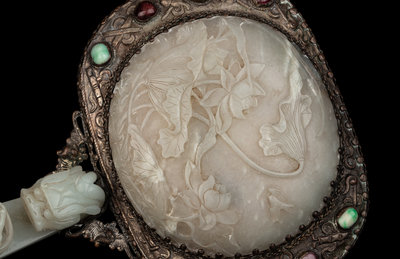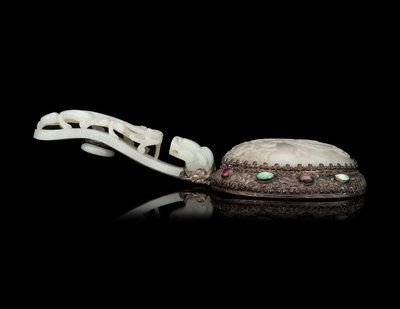 having a circular white jade plaque carved in relief with peony and lotus mounted with silvered metal chased with auspicious symbols interspersed with jadiete and hardstone cabochons, all supported by a heafty celadon jade chilong belthook serving as a handle.
