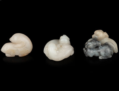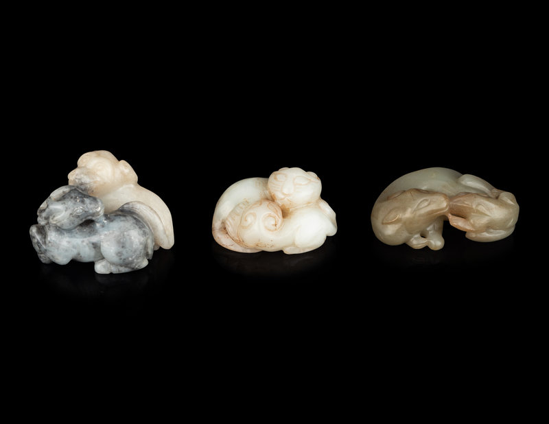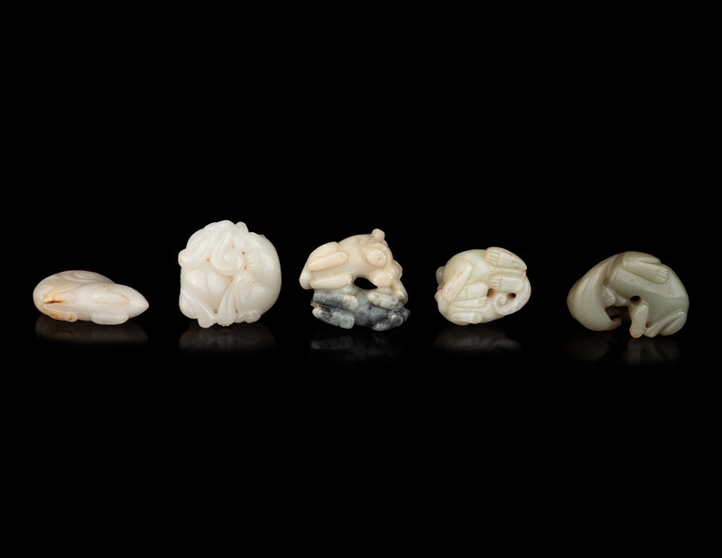 comprising two white jade examples, one with a pair of mythical beasts, the other bears, one white and grey group with a ram and a dog, a pale celadon group of cats with butterflies, and a celadon group of badgers.