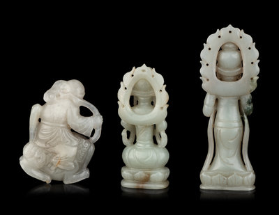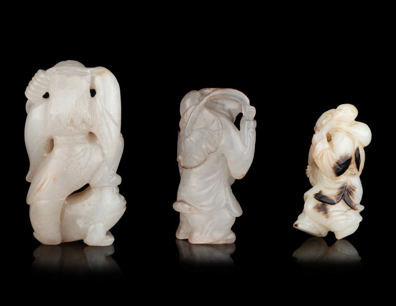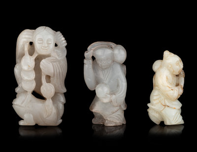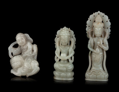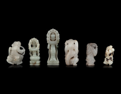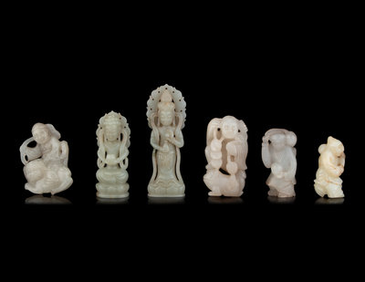 comprising two figures of deities, two figures of boys, a figural group of immortal Liu Hai and the three-legged toad and a figure of male riding on a recumbent fu lion.