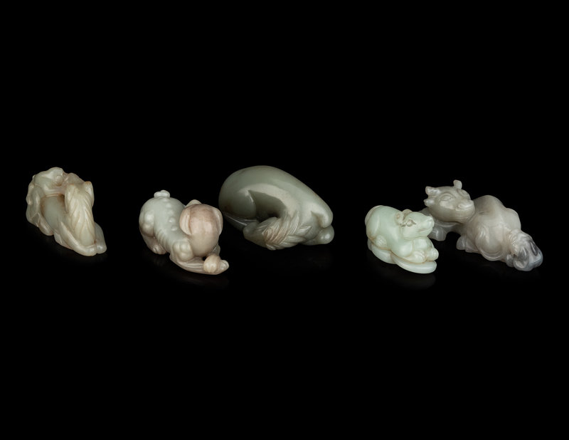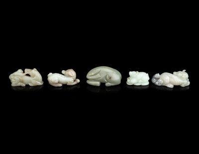 Five Chinese Carved Celadon Jade Figures of Recumbent Animals