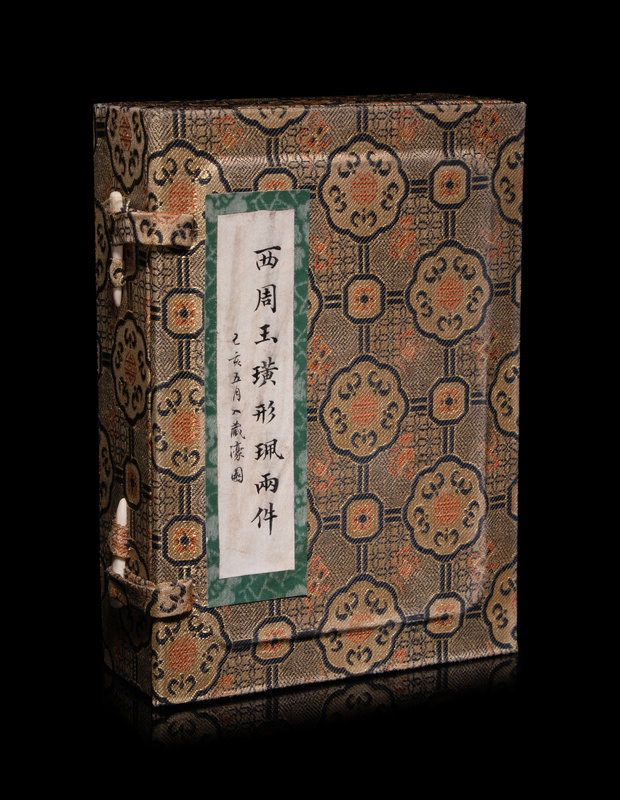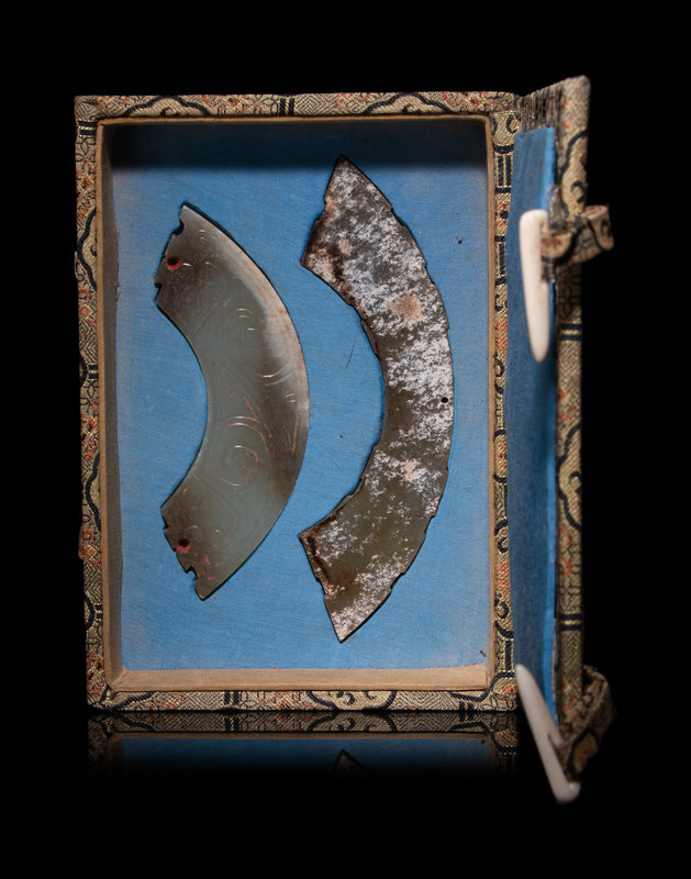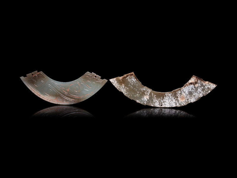 each having notches at the short sides, comprising one of mossy celadon and russet tone carved in low relief, the other mottled with snowy calcifications.