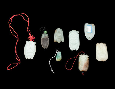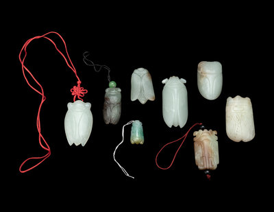 Eight Chinese Jade and Jadeite Cicada-Form Pendants