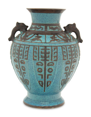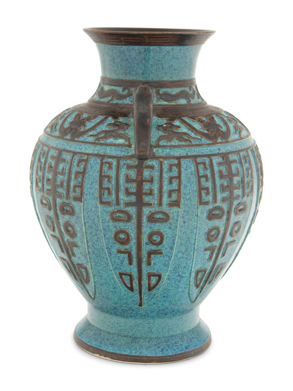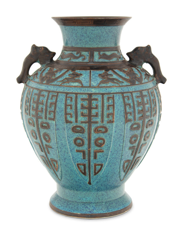 the globular body in the form of an inverted pear supported by a spreading foot, all narrowing at angled shoulders mounted with mythical beast busts forming handles. Decorated with a brown glaze to archaistic relief decoration against the dappled blue ground.