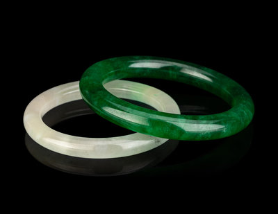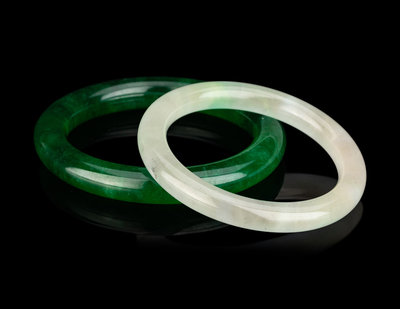 the two cylindrical bangles with the first of green tone, the second of pale celadon tone with apple green hue.