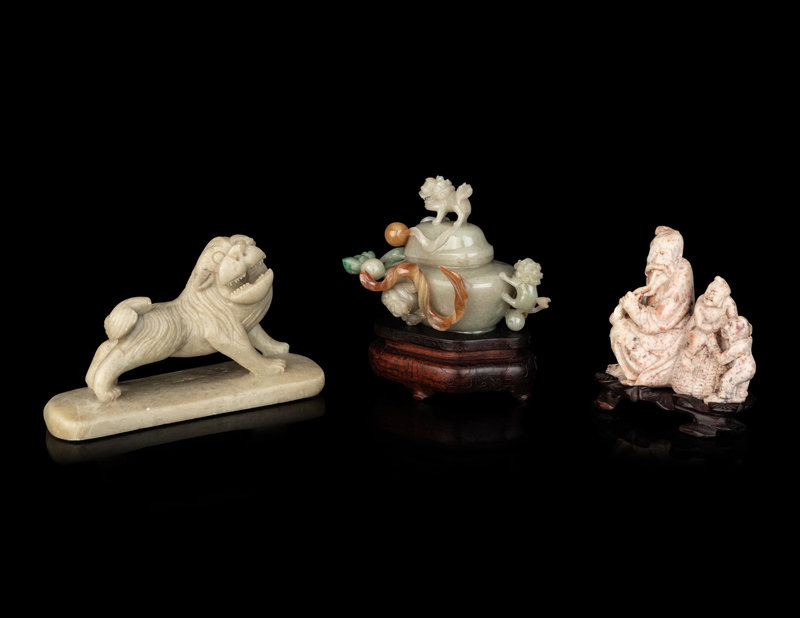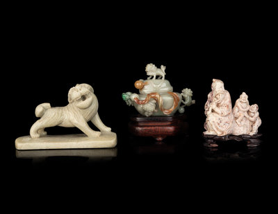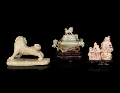 the first a covered vessel, the second a mythical beast, the third a 'scholars and boys' figural group.