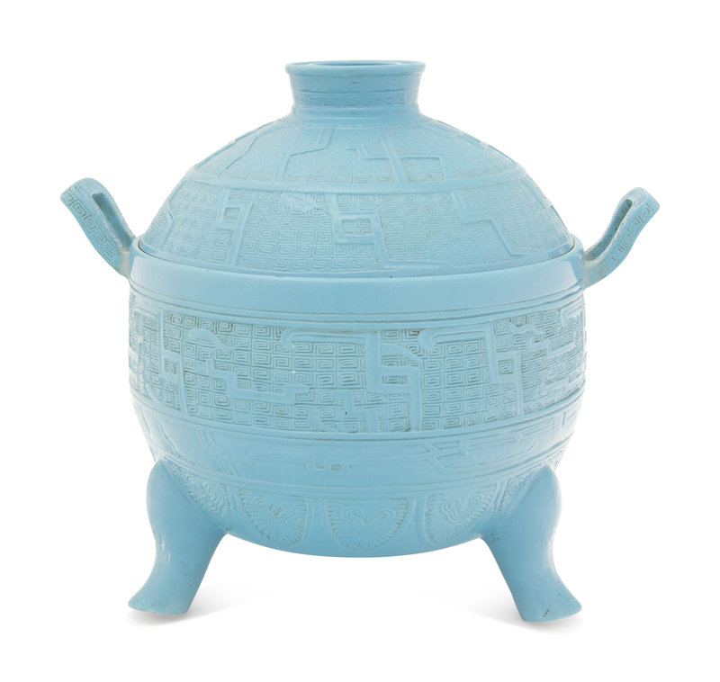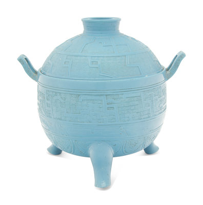 the globular body nestled above three squat outturned legs, and flanked by inverted u-form handles, all surmounted by an inverted dish-form cover. The exterior carved in relief with concentric bands of archaistic designs.