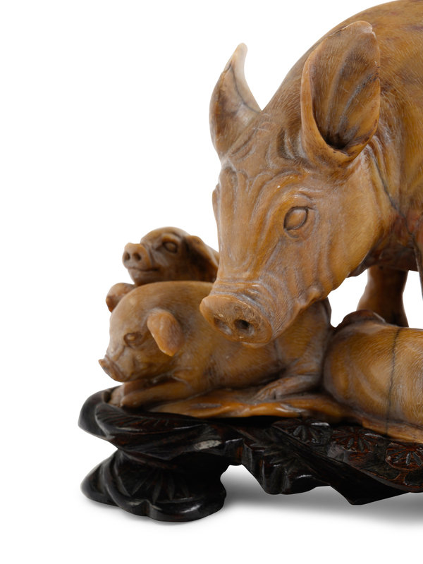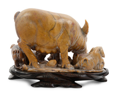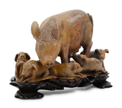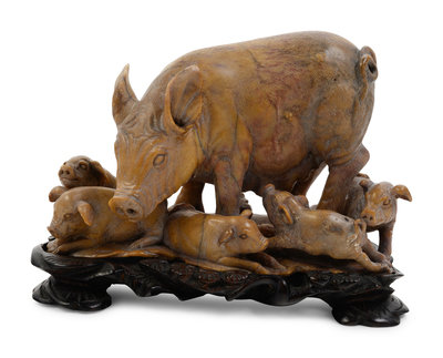 A Chinese Carved Soapstone Figure of Pig and Piglets
