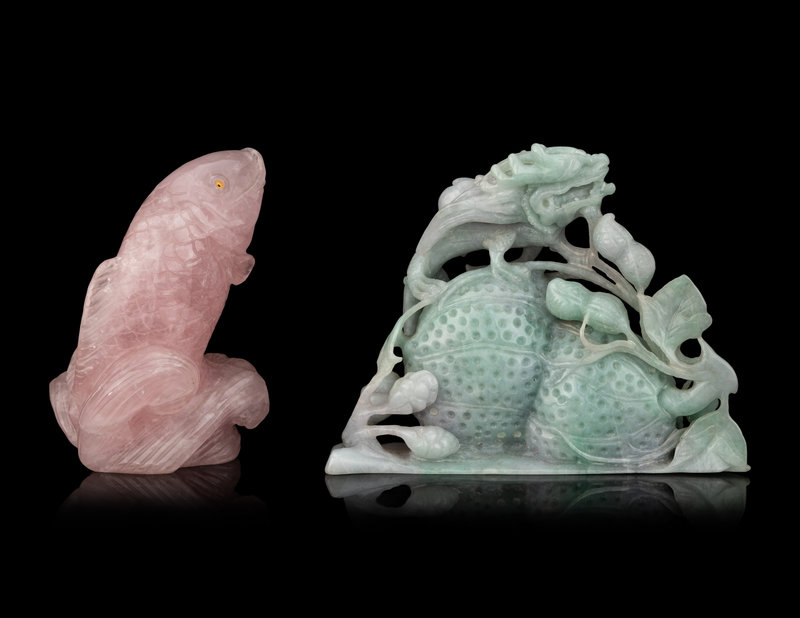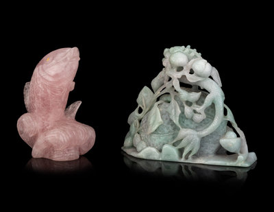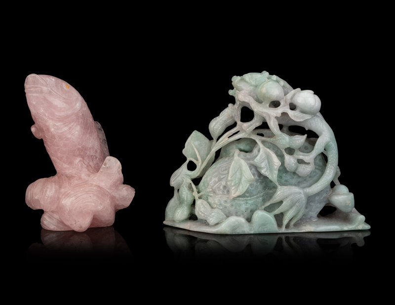 the first a rose quartz figure of a carp, the second a jadeite group of dragon, peanuts and peaches.