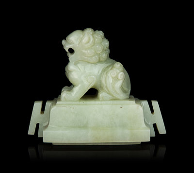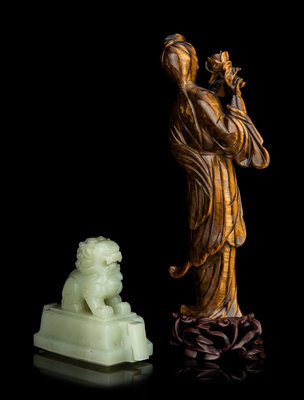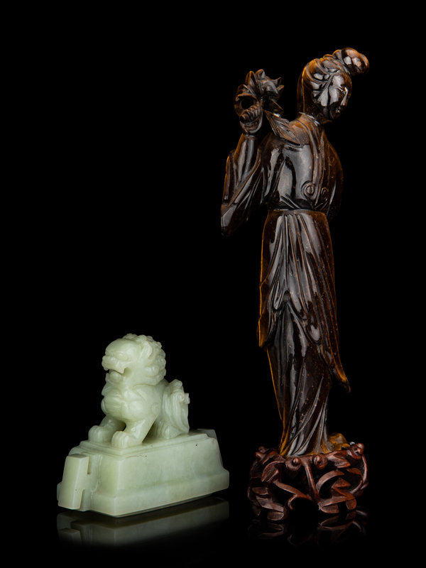 the first a tiger's eye figure of a lady, the second a celadon jade cover with a fu lion finial.